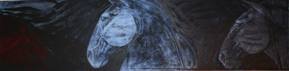 Marla Merante's series of paintings conjure visions of the mystery of animals' nocturnal lives. "While horses sleep on the average of not much more than four hours a day, I often wonder what they are doing in our darkest hours of sleep. As we start each day with our "morning chores" on the farm, my mind wanders, dreaming of what came to pass the night before..... My canvasses in blue are imagined glimpses into the secrets hidden to all but the animals under the dark veil of night.